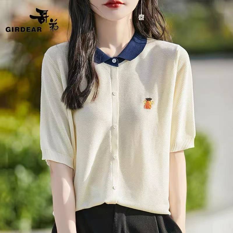 Blusa crema con cuello azul marino